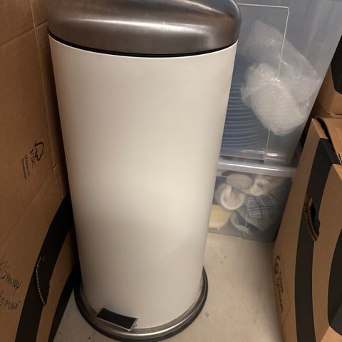 Helt i plast med en pedal som öppnar. Ca 60 hög och rymmer 50-60 literspåsar.