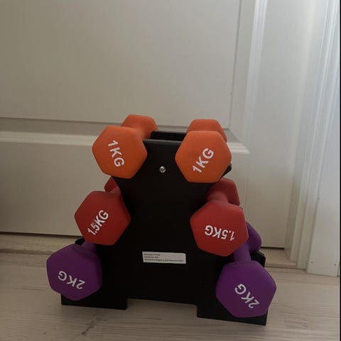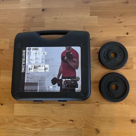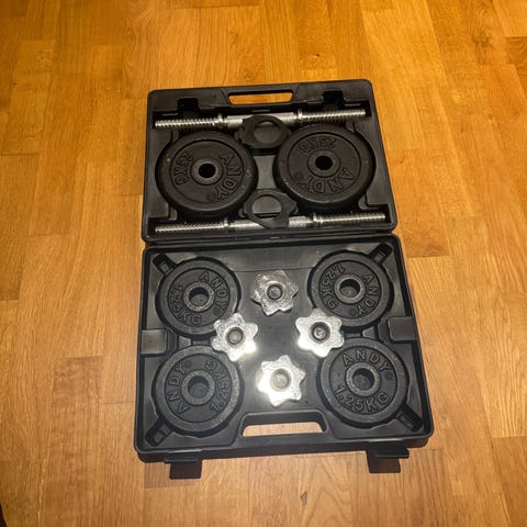 Energetics hantelset som inkluderar viktplattor i olika storlekar och en stång med låsmuttrar. Viktplattorna är märkta med vikter med olika vikter på som total vikt ( 9. kg ) Setet levereras i en bärbar förvaringsväska av hårdplast. Enligt på bilder finns i Västerås .