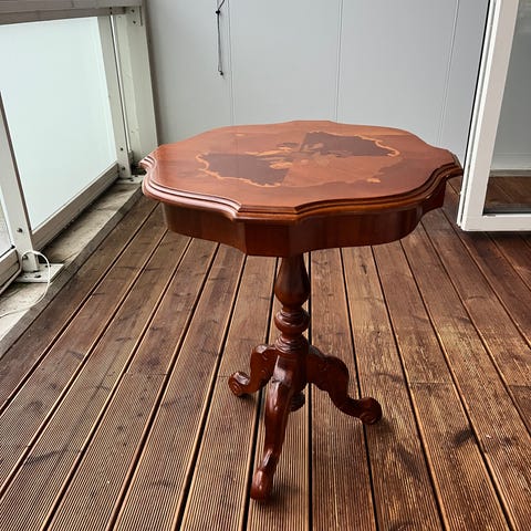 Träbord antik stil – runt soffbord/sidobord Ø90 cm, höjd 63 cm