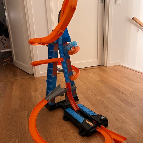 Hot Wheels biltransportör och bilbana set med orange och svart färg. Innehåller flera delar för att bygga en bilbana och transportera bilar. Passar barn som gillar bilbanor och billek.