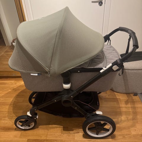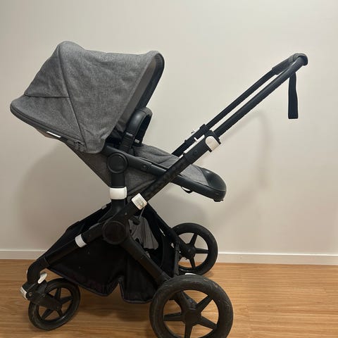 Bugaboo Fox2 barnvagn i grått tyg/grey melange med justerbart handtag och säkerhetsbälte. Utrustad med förvaringskorg under sitsen och solskärm. Ej slitage, repor eller solblekta tyger. Bygel har mattats av se bild, går lätt att rusta upp eller bytas ut.