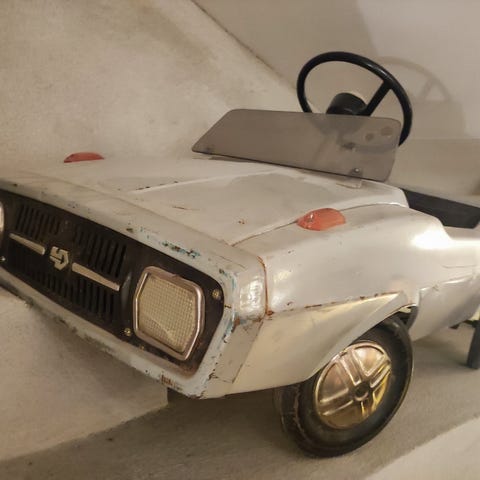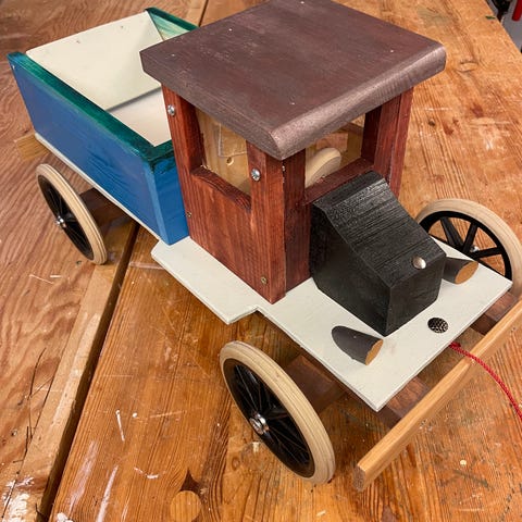 Träbil leksak i röd och beige färg. Tillverkad i trä med detaljer som öppningsbara dörrar och hjul. Leksaken har en klassisk design med en kombination av naturträ och röda målade delar.