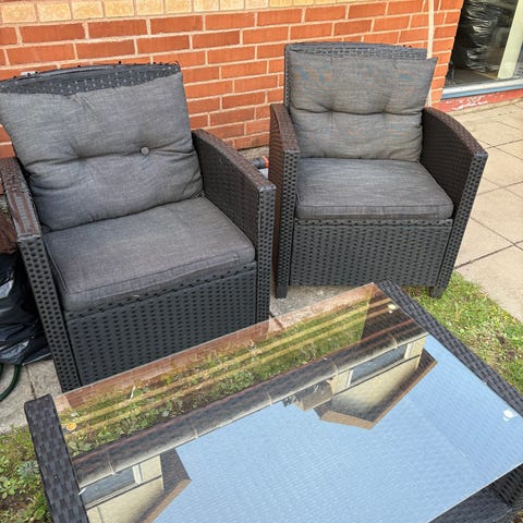 Utemöbelset i rotting bestående av två fåtöljer, en tvåsitssoffa och ett bord med glas. Dynor i mörkgrått medföljer. Passar för utomhusbruk på balkong, altan eller trädgård.