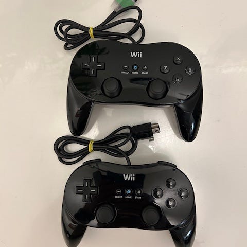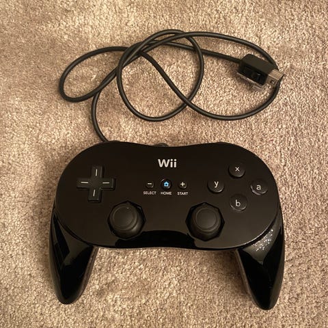 Nintendo Wii Pro Controller i svart färg. Handkontroll med anslutningskabel för Nintendo Wii-konsol. Utformad för bekväm användning med traditionella knappar och styrspakar.