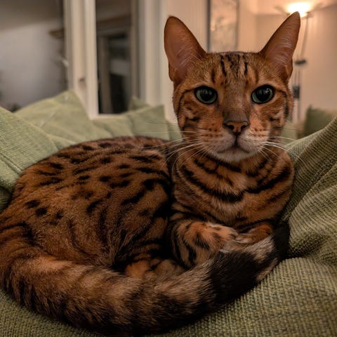 Hon är van vid det mesta som att åka bil, duscha, klippa klor och pälsvård. Hon är van vid andra katter och hundar. Hänger gärna med på promenader.