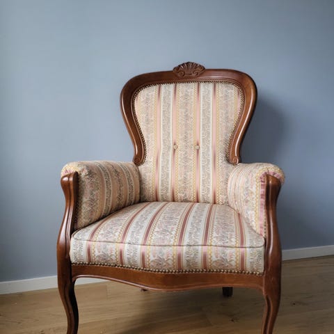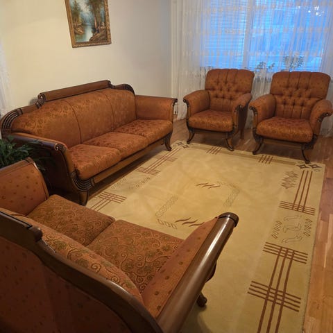Klassisk och tidlös design i brun/mocca-ton med dekorativa detaljer och ljusa ben. Möblerna är stabila och bekväma med normalt bruksslitage, men inga skador som påverkar funktion.