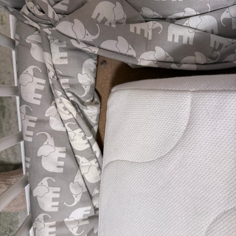 Barnsäng / spjälsäng med madrass. Justerbar bottenhöjd (låg eller mitten). Stabil.