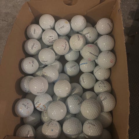 Vi har alla märken från Pro v1 till taylormade i två klasser. Första och andra klass. Hör av dig vid minsta fråga eller köp. Bestäm din egna mix med hur många du vill ha. Den tredje bilden är ett exempel på hur första klass kan se ut, och den fjärde är andra klass. 😀