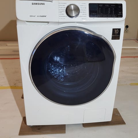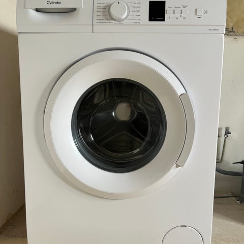 Cylinda tvättmaskin med frontmatning. Vit färg med standardstorlek för hushållsbruk. Utrustad med flera tvättprogram och en digital display för inställningar.