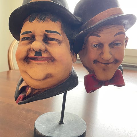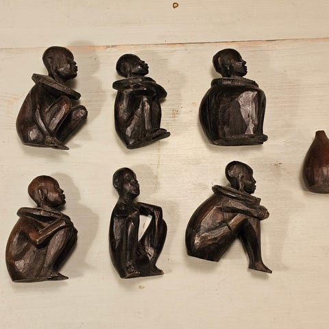 Väggdekorationer i gips/lera föreställande två ansikten i profil. Dekorationerna är målade i svart med detaljer i metall och har en textur som efterliknar hår och smycken. Hängas på vägg med fästanordningar på baksidan.