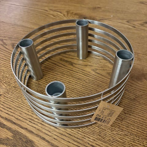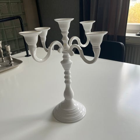 3 armad ljusstake i porslin. Foten är 11,5 cm i diameter. Som bredast 21 cm.