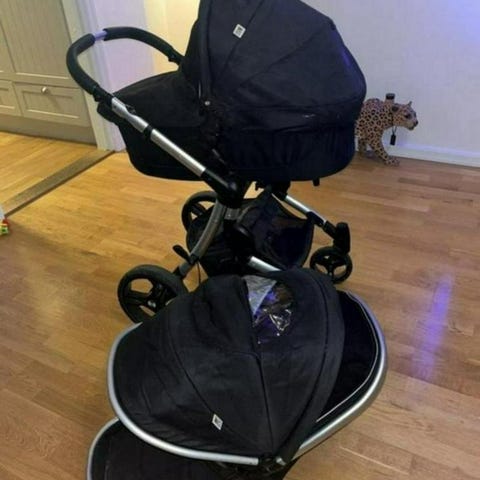 Crescent barnvagn i mörkblå färg med svart chassi och bruna handtag. Barnvagnen är utrustad med fyra hjul och har en rymlig liggdel för barnet.