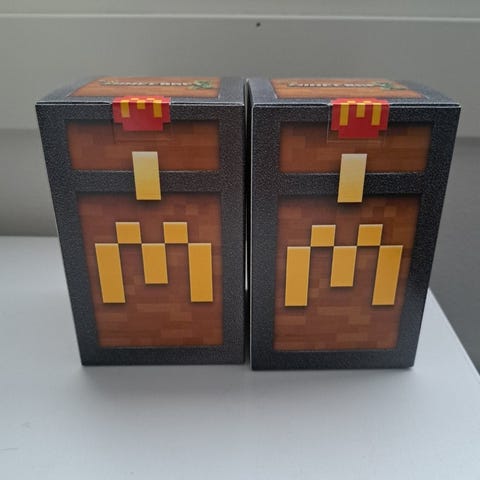Minecraft Actionfigurer som föreställer karaktärerna Enderman och Iron Golem. Figuren av Iron Golem har en beige och grön kamouflagemönstrad design och levereras med en blockdetalj. Enderman-figuren är svart med lila ögon. Dessa figurer är baserade på karaktärer från spelet Minecraft.