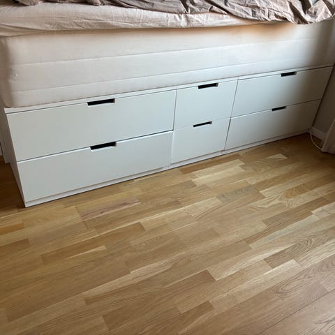 En fin vit sängram från VidaXL för 2 st 80x200 sängar. Obetydligt använd. Yttermått 205x165, höjd 31 cm respektive 69 cm vid sänghuvudet. Ganska så komplicerat att montera ihop men med lite god energi så blev det till slut bra/fint. Klart viktigt att förstärka den under med några metalldelar och då så blev den betydligt stabilare.