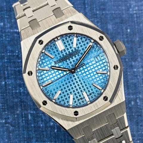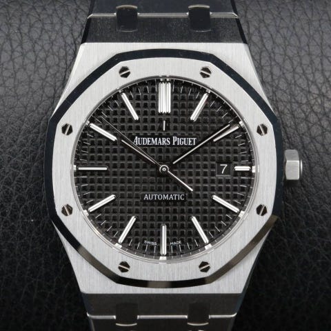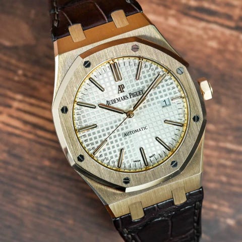 - Band: Audemars Piguet OEM alligator (brunt) med roséguld deployant