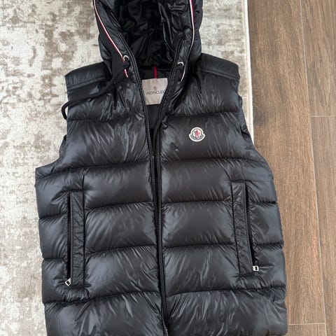 Moncler Västar i storlek S, svart färg och tillverkad av dun. Västen är avsedd för herrar och erbjuder isolering och värme med ett lätt materialval.