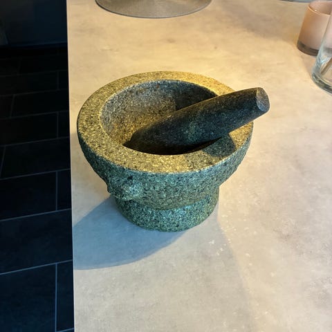 Mycket bra mortel tillverkad i mässing. Verktyget består av en skål och en stöt, avsett för att mala och krossa kryddor eller örter.