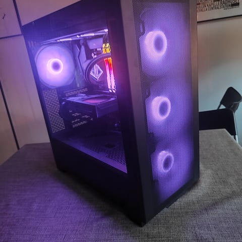 MSI MPG B550 Gaming Plus stationär speldator med ASUS GeForce RTX 4060 EVO Dual OC-grafikkort, AMD Ryzen 7 3700X-processor, 32 GB Corsair DDR4 RAM och 1 TB PNY NVMe SSD. Datorn är utrustad med en Kolink Umbra Void ARGB 360mm kylare och har ett tempered glass-chassi. Strömförsörjning sker via en Corsair RM850e 850W nätaggregat. Operativsystemet är Windows 11 Home. Datorn har vattenkylning och bra luftflöde, med anpassningsbar belysning.