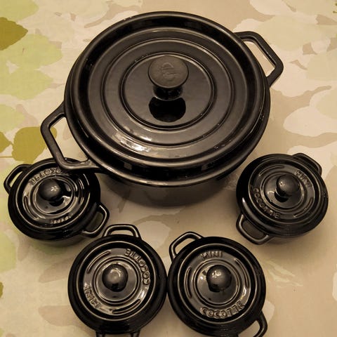 Le Creuset Stoneware gryta i set om 4 delar. Tillverkad av stengods med svart yta. Setet består av fyra grytor med lock i storleken 10cm, lämpliga för matlagning och servering.