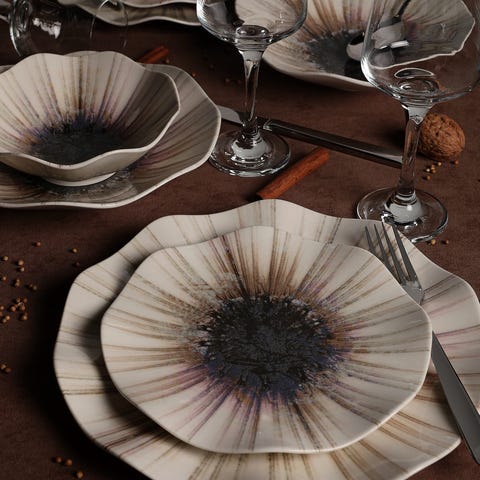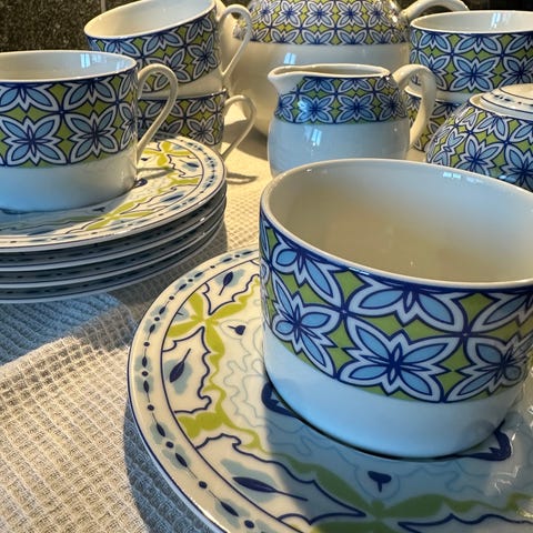 En 36-delars kaffeservis från Ridgeways Potteries Ltd; Royal Adderley fine bone china. Det är 12 koppar inkl fat samt 12 assietter. Dom verkar skifta i blåa, gröna och rosa toner. I fint skick bortsett från sprucken lasyr. Avhämtning i Kållered men kan skickas.