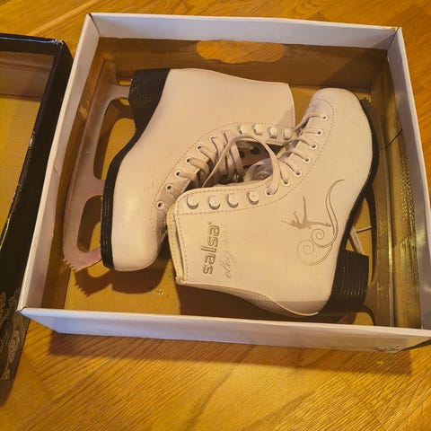 Skridskor i barnstorlek 34 och 35, vita i färgen. Två första bilderna är 34 och de övriga 35. Pris 50 kr paret.