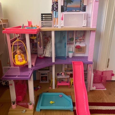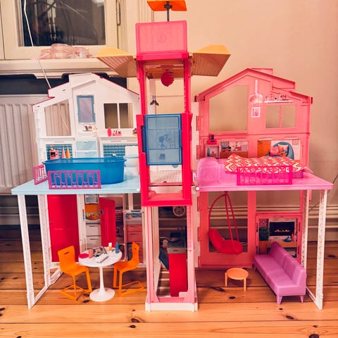 Barbie dockhus för barn med flera våningar och olika rum. Inkluderar möbler och tillbehör i färgerna rosa, lila och blå. Passar för lek och inredning med Barbies leksaker.