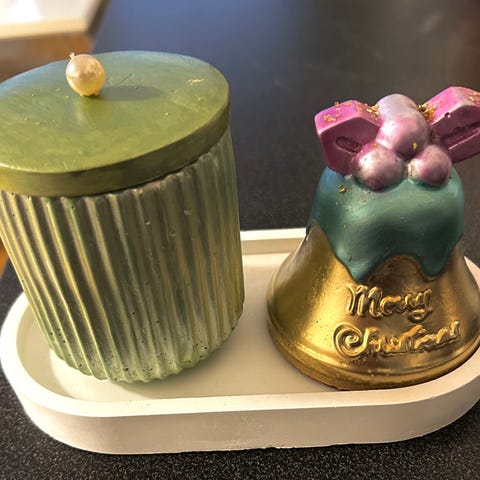 Gratis Gips hand arbete Dekoration för julen. Består av en hexagonal bricka och en dekorativ föremål med rundad form. Färgen är guld och materialen är anpassade för inomhusbruk som säsongsdekoration.