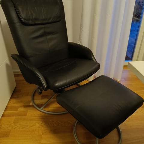 Säljer en bekväm och stilren klubbfåtölj i brunt läder och sammet. Skön att sitta i och passar fint i både vardagsrum, läshörna eller kontor.