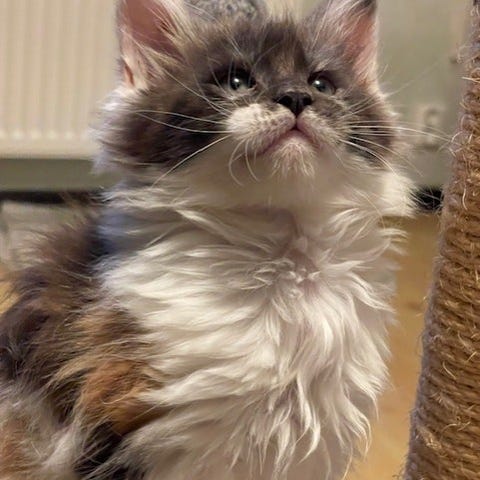 MODER: Maine Coon 6,2 kg med stamtavla med den läckra färgen Rödsmoke Harlekin m. vitt . Hennes päls är lättskött, långhårig och glansig som inte tovar sig. Supersocial knäkatt och älskar att ansikts-puffa.