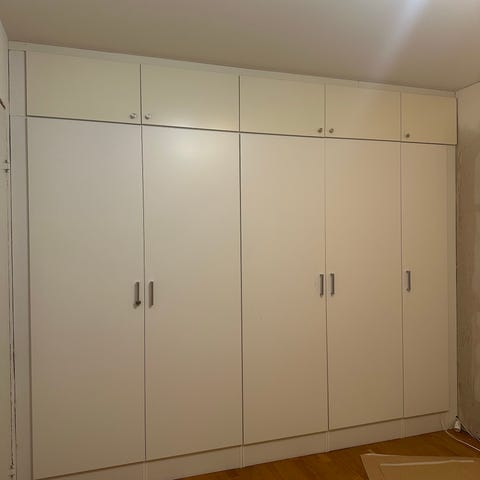 Två vita Vedum högskåp, båda 210 höga. Båda skåpen har små skruvhål där täcksidor tidigare har monterats därav priset, se bilder. Säljes med det som syns på bilderna (inga extra hyllor eller annan inredning).