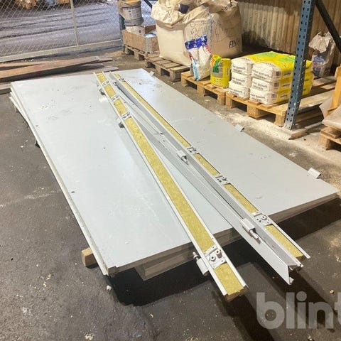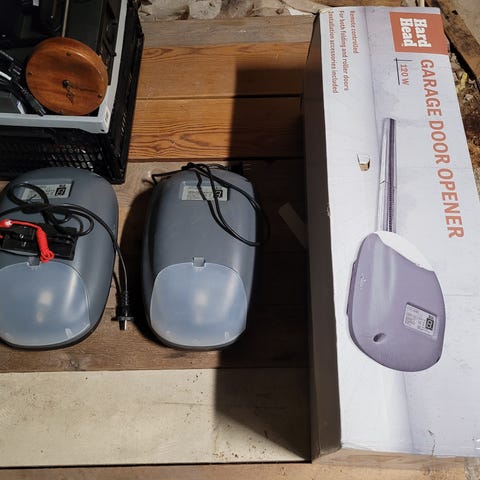 Två vita garageportar, Crawford, nedmonterade. Ena är motoriserad, motorn snurrar men drar inte upp porten.