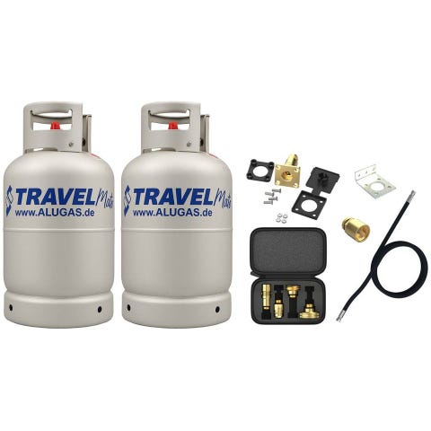 Två gasflaskor med en vikt på 10 kg vardera. Flaskorna är gråa och avsedda för förvaring och transport av gas. Gasflaska stål fylla på till husbil/ husvagn 600,- per styck.