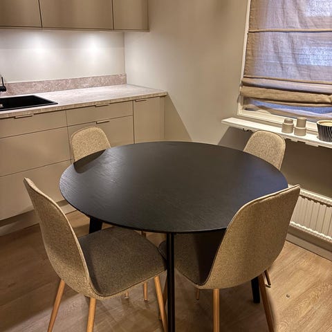 1 stol är lite högre 1 dom andra då den blir mer barnvänlig, kan kapa den till samma längd som dom andra om så önskas.