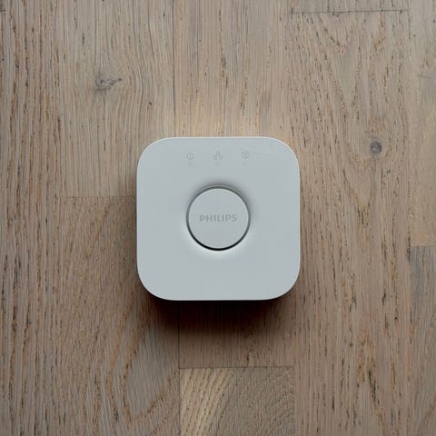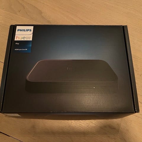 Philips Hue Sync Box i svart färg. En enhet för att styra Philips Hue-ljus via ljud/bild, Inkluderar strömadapter och har flera anslutningsportar för integration med Hue-systemet.