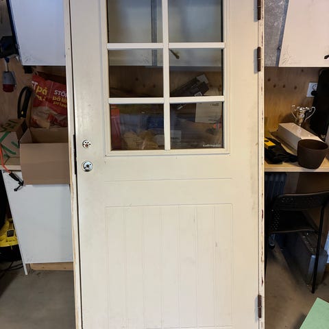 Ytterdörr i vitt med glasfönster och karm. 10x21