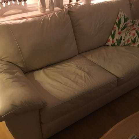 Svart lädersoffa med plats för två personer. Soffan har vadderade armstöd och sittdynor, lämplig för vardagsrum eller loungeområden. Materialet är läder, vilket ger en slitstark och lättskött yta.