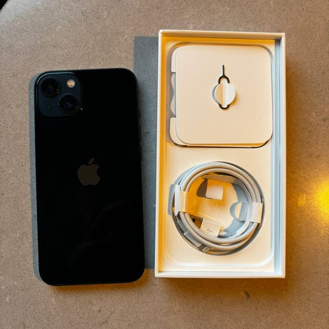 Apple iPhone 13 med 128 GB lagringskapacitet i svart/mörkblå färg. Telefonen har alltid haft skal, så inga kantstötningar eller repor. Batterihälsan är 85% och telefonen är olåst.