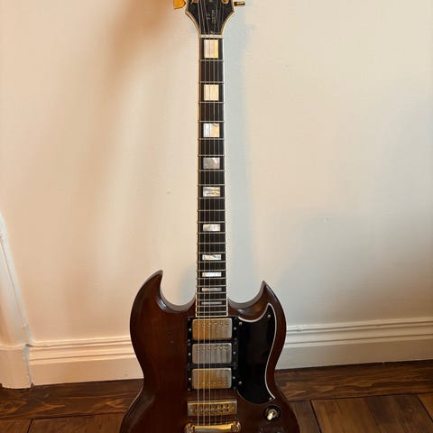 Lätt (3088 g), mid 50’s soft V-hals, 9.5” radius, 6105-band. Från fabrik sitter det SD ’59 i halsen och CS Nocaster i stallet (Dimarzio Chopper + 500k-pottar sitter i nu). Alla originaldelar medföljer.
