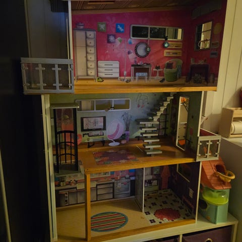 Barbie dockhus med flera våningar och rum, inklusive möbler och tillbehör i rosa och vita färger. Passar för barnlekar och samlingar.