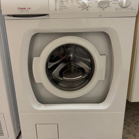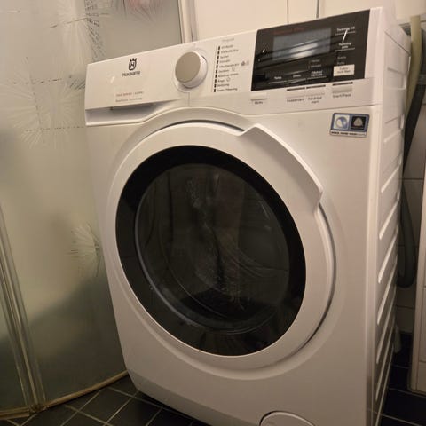 Electrolux frontmatad tvättmaskin med flera programval och digital display. Maskinen är avsedd för tvätt och har en vit färg. Den är utformad för hushållsbruk.