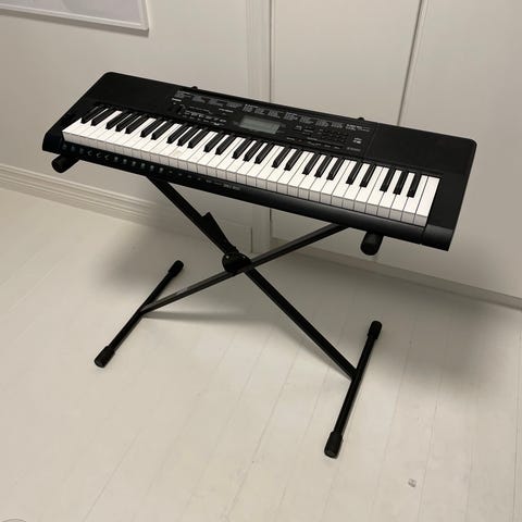 Casio LK-280 keyboard med key Lightning System tangenter och inbyggda funktioner för musikskapande. Inkluderar hörlurar och notställ. Färg: grå.