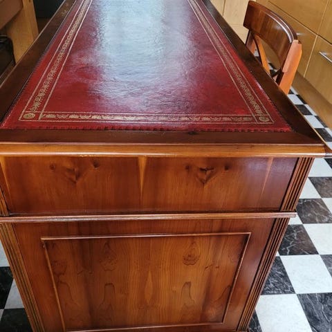 Engelskt skrivbord med vacker grön läderklädd skrivyta.