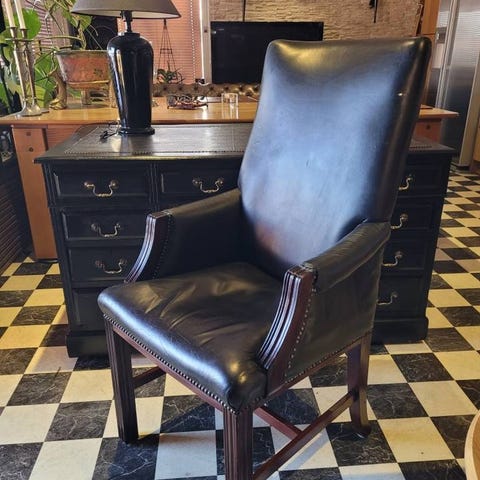 Till skrivbordet medföljer en matchande stol med sits i exklusivt engelskt tyg, mycket bekväm och av hög kvalitet.
