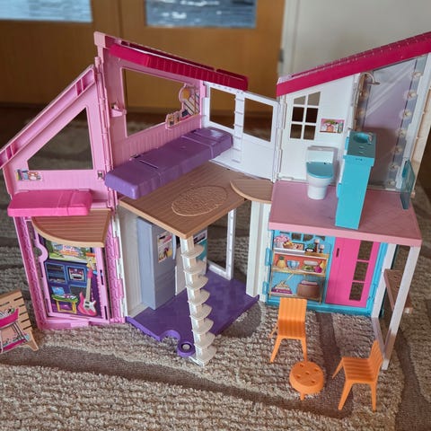 Stort barbiehus från Kidcraft, nypris ca 1600kr. En påse med tillbehör följer med (flertal barbies med kläder, skor, inredning)