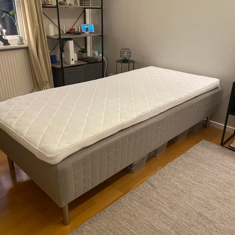 Ikea säng i mycket fint skick, Skårer heter modellen. Ingår bäddmadrass Tustna och runda ben i ek. Vi har haft överdrag på resårbotten som vi skickar med samt madrasskydd. Hämtas i Nacka.