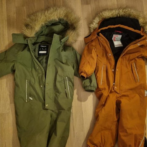Reima overaller i storlek 98 och 122, använda 2 vintrar. Den större något mer sliten men även den i bra skick (saknar rem under foten).