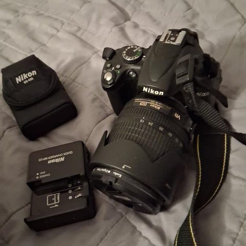 Nikon D3100 Digital kamera i röd färg. Kameran är en digital spegelreflexkamera (SLR) lämpad för fotografering i olika miljöer. Levereras med tillbehör inklusive objektiv, batteri, minneskort och laddare.