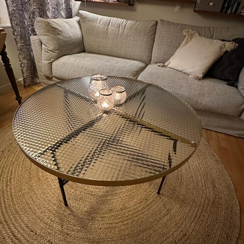 Runt soffbord med ram och hylla i ek samt glasöverdel.