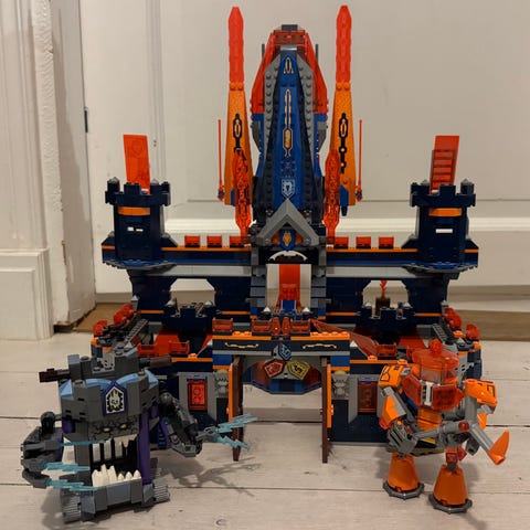 LEGO Nexo Knights set med flera figurer och fordon. Setet innehåller detaljerade modeller, inklusive en stor stridsvagn och ett rött odjur. Finns som serie, liknar ninjago.
