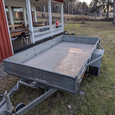Väldigt lätt och smidigt släp, går utan problem att flytta ensam då den har låg vikt. Både fram- och baklämmar går att fälla ner, även ta bort helt.